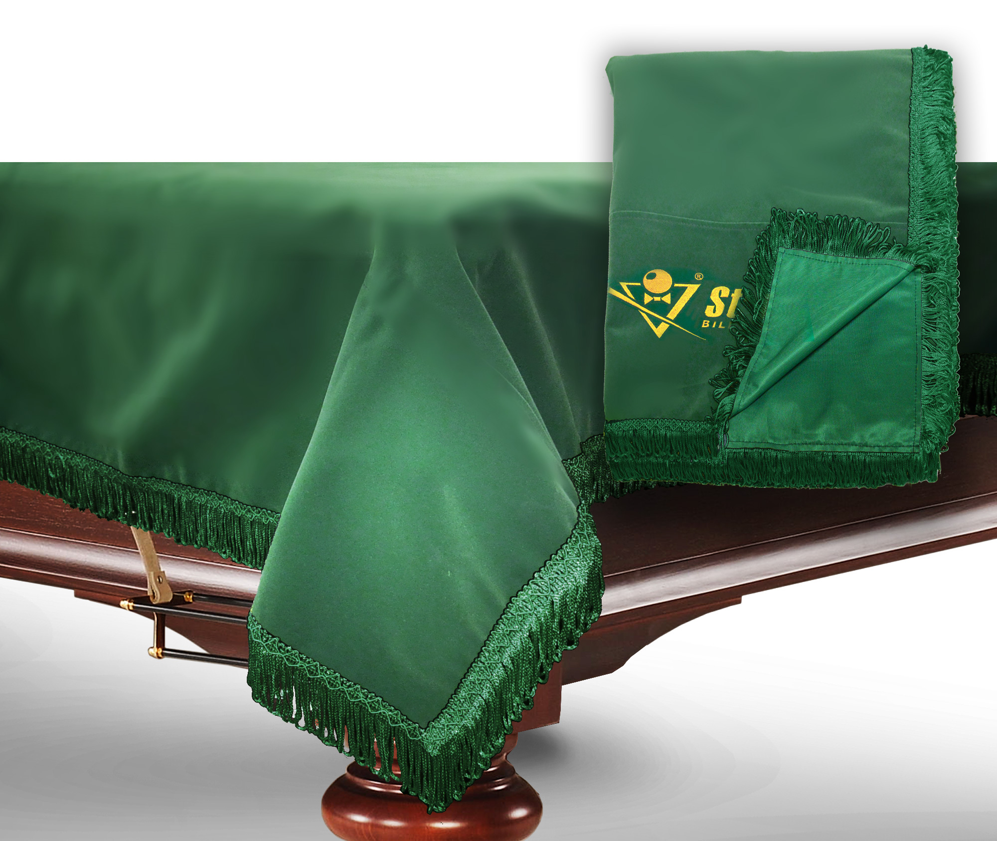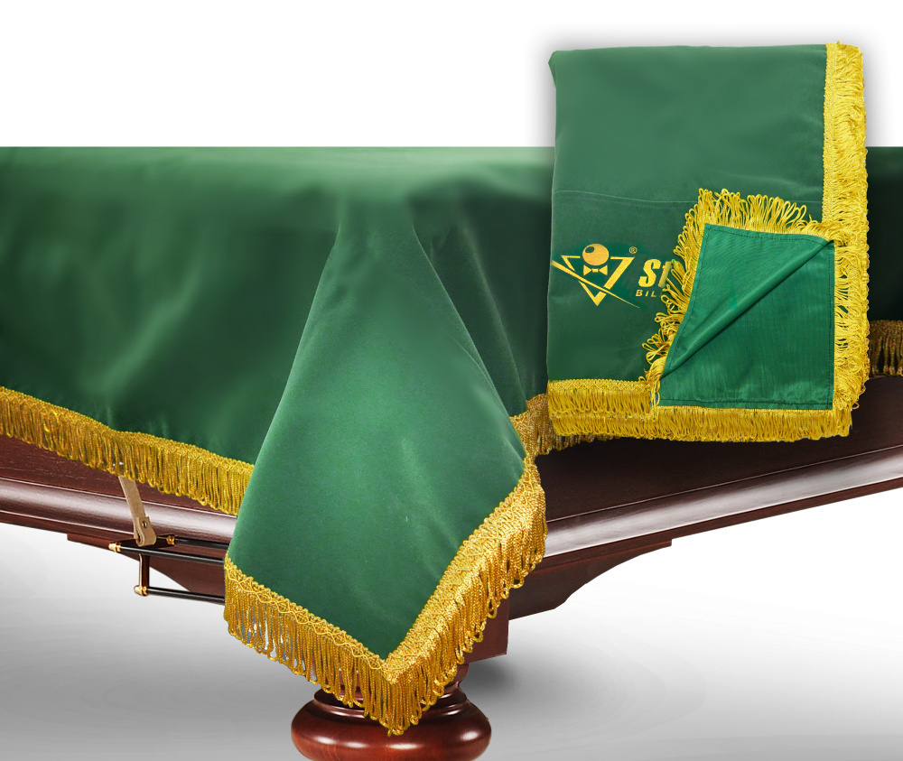 Чехол бархатный, обрамленный бахромой, надежно предохраняет бильярд от внешних воздействий. Изготовлен из бархата - мягкой ткани, с коротким ворсом и шелковистым блеском - смотрится стильно и роскошно. Края покрывала украшены ярко-желтой бахромой. Основная функция чехла — защищать бильярдный стол от повреждений, пыли и влаги, яркого солнечного света. Стол накрывают чехлом на то время, когда он не используется в игре. В любом помещении всегда есть пыль, и она будет оседать на неприкрытое сукно, постепенно впитываясь в него. Слишком частые чистки сукна щетками не желательны, так как это приводит к его преждевременному износу, а услуги по перетяжке сукна на бильярдном столе недешевы. Использование чехла является логичным решением для минимизации затрат по уходу за бильярдным столом.