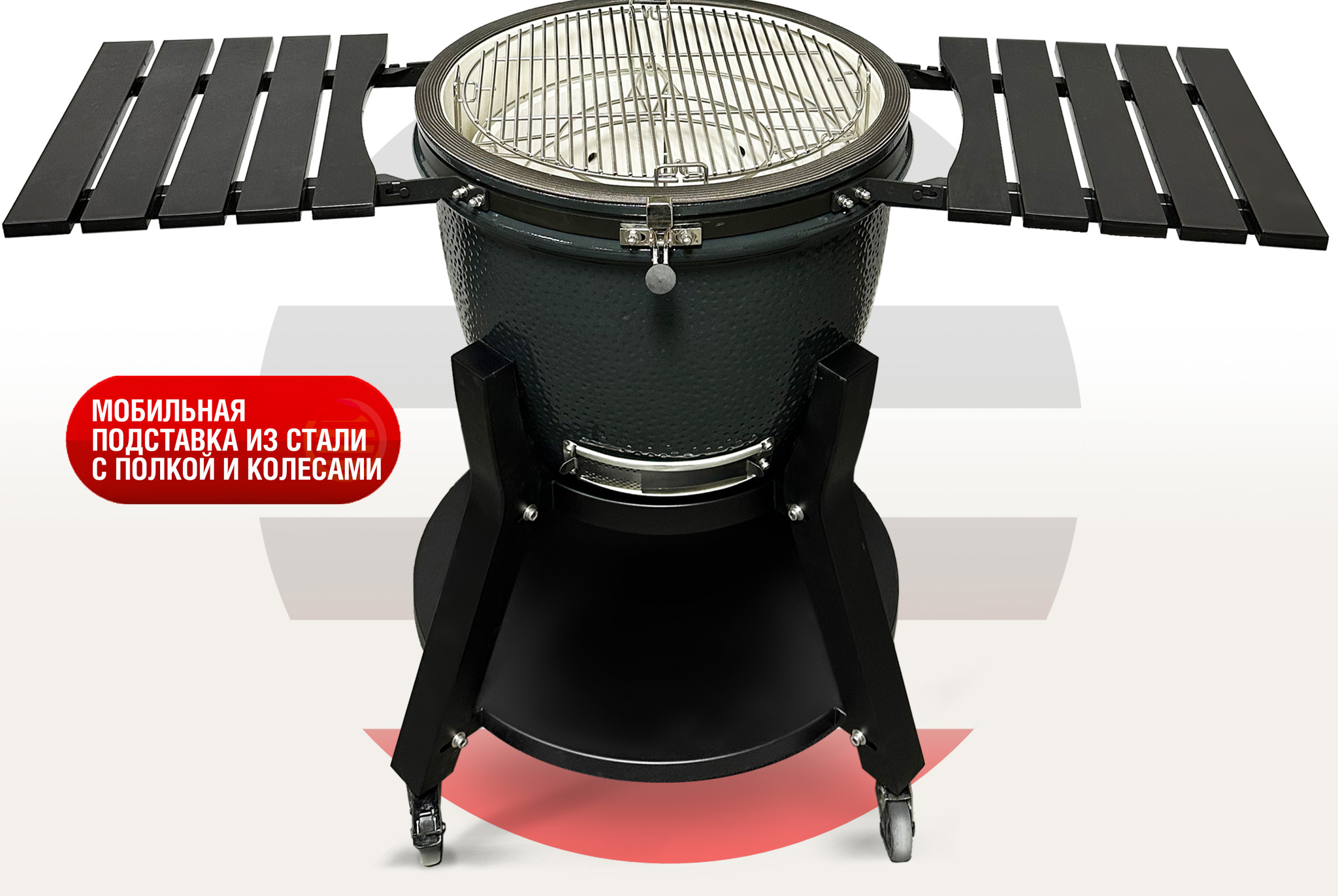 Мобильная подставка с колесами, оснащенными фиксаторами, выполнена из стали, что гарантирует высокую надежность и легкость перемещения гриля. Подставка оснащена стальной полкой для удобного размещения аксессуаров и кухонной утвари.