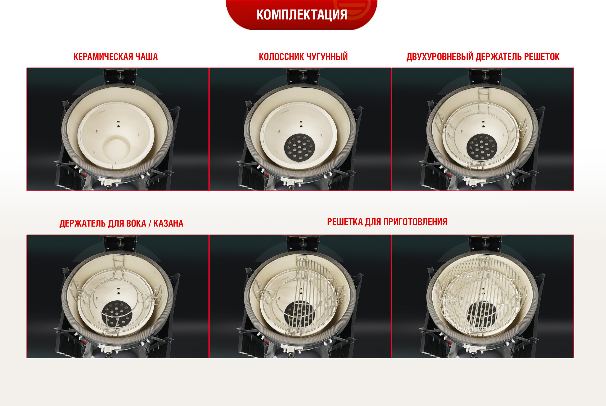 Гриль оснащен трехуровневой системой решеток. Верхняя решетка выполняет функцию гриля, средняя служит подставкой для вока (не входит в комплект), казана (не входит в комплект) или камня для пиццы (не входит в комплект), нижняя - для керамического жароотсекателя (не входит в комплект), который обеспечивает равномерное распределение тепла.