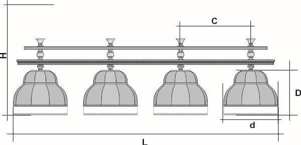 Ни для кого не секрет, что качественное освещение способствует не только хорошей игре, но и не оставляет усталости глаз после продолжительной игры в бильярд. Светильники АРИСТОКРАТ обладают всеми необходимыми характеристиками, чтобы игра в бильярд приносила только удовольствие. Условные схематические обозначения: Н — общая высота светильника / 2065 мм L — общая длина светильника / 2420nbsp;nbsp;мм D — высота плафона / 395 мм d — диаметр плафона / 500 мм C — расстояние между осями / 640 мм