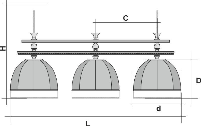 Ни для кого не секрет, что качественное освещение способствует не только хорошей игре, но и не оставляет усталости глаз после продолжительной игры в бильярд. Светильники Аристократ-Люкс обладают всеми необходимыми характеристиками, чтобы игра в бильярд приносила только удовольствие. Условные схематические обозначения: Н — общая высота светильника / 2065 мм L — общая длина светильника / 1780nbsp;nbsp;мм D — высота плафона / 395 мм d — диаметр плафона / 500 мм C — расстояние между осями / 640 мм