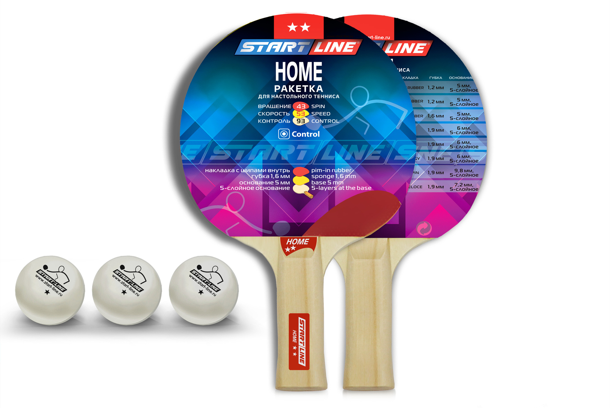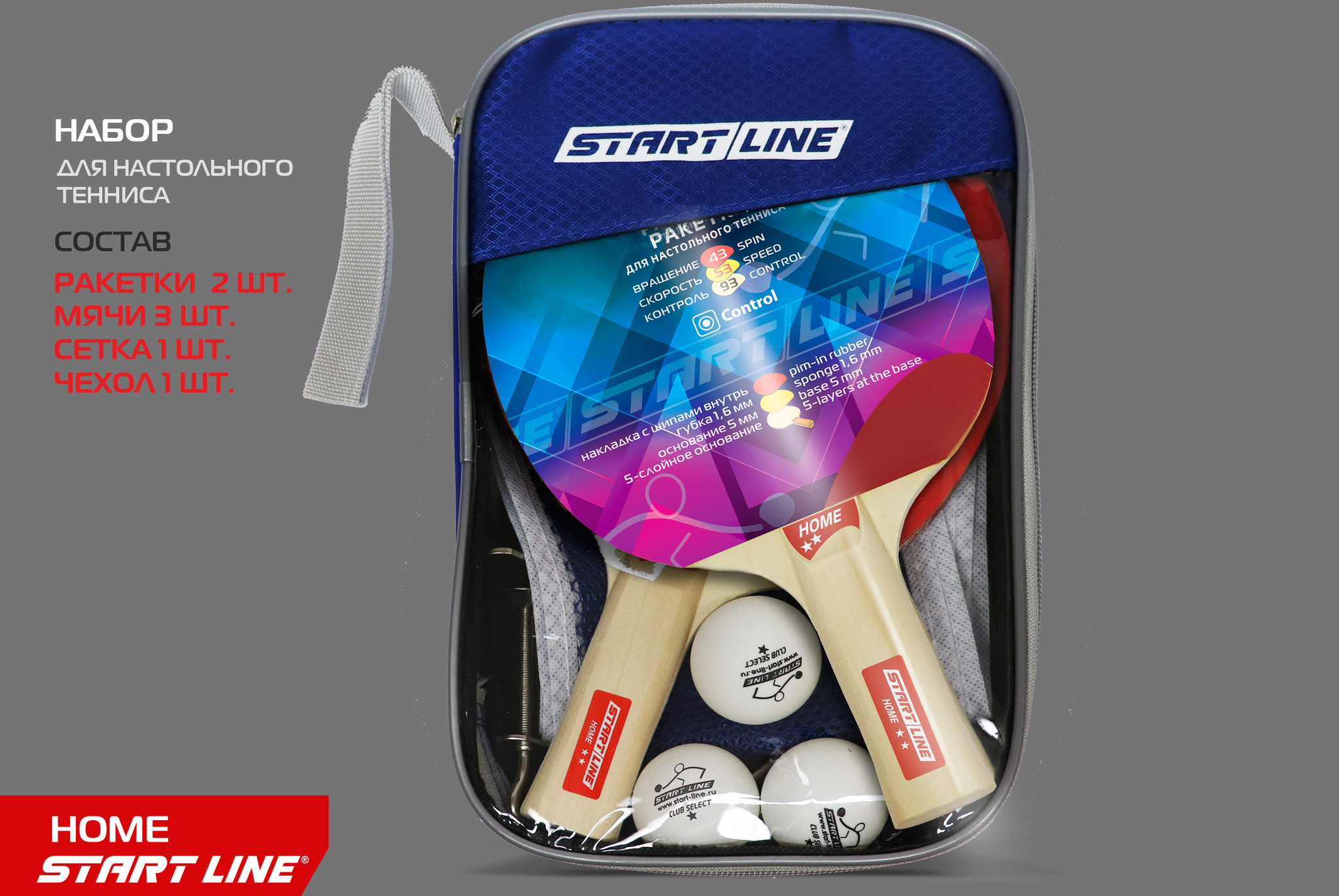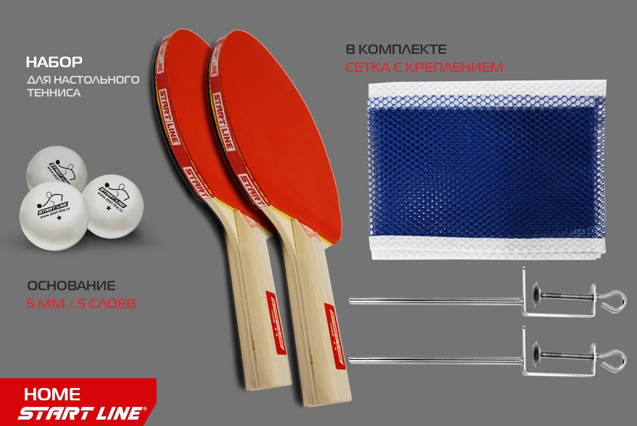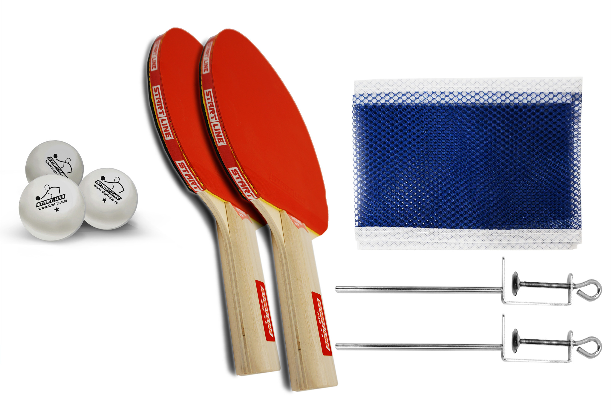 Набор START LINE: 2 Ракетки Home 2 звезды, 3 Мяча, Сетка с креплением, упаковка блистер.