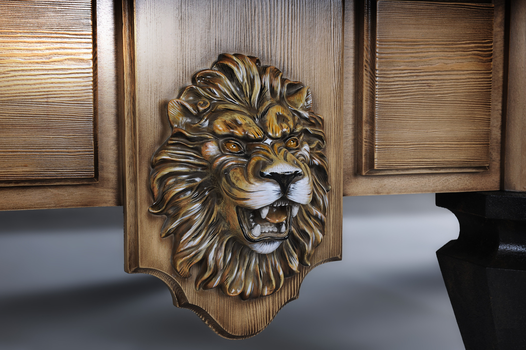 Декор стола сочетает в себе барельеф царя зверей - льва, символ силы, мужества и оленя - символ возрождения жизни и созидания.