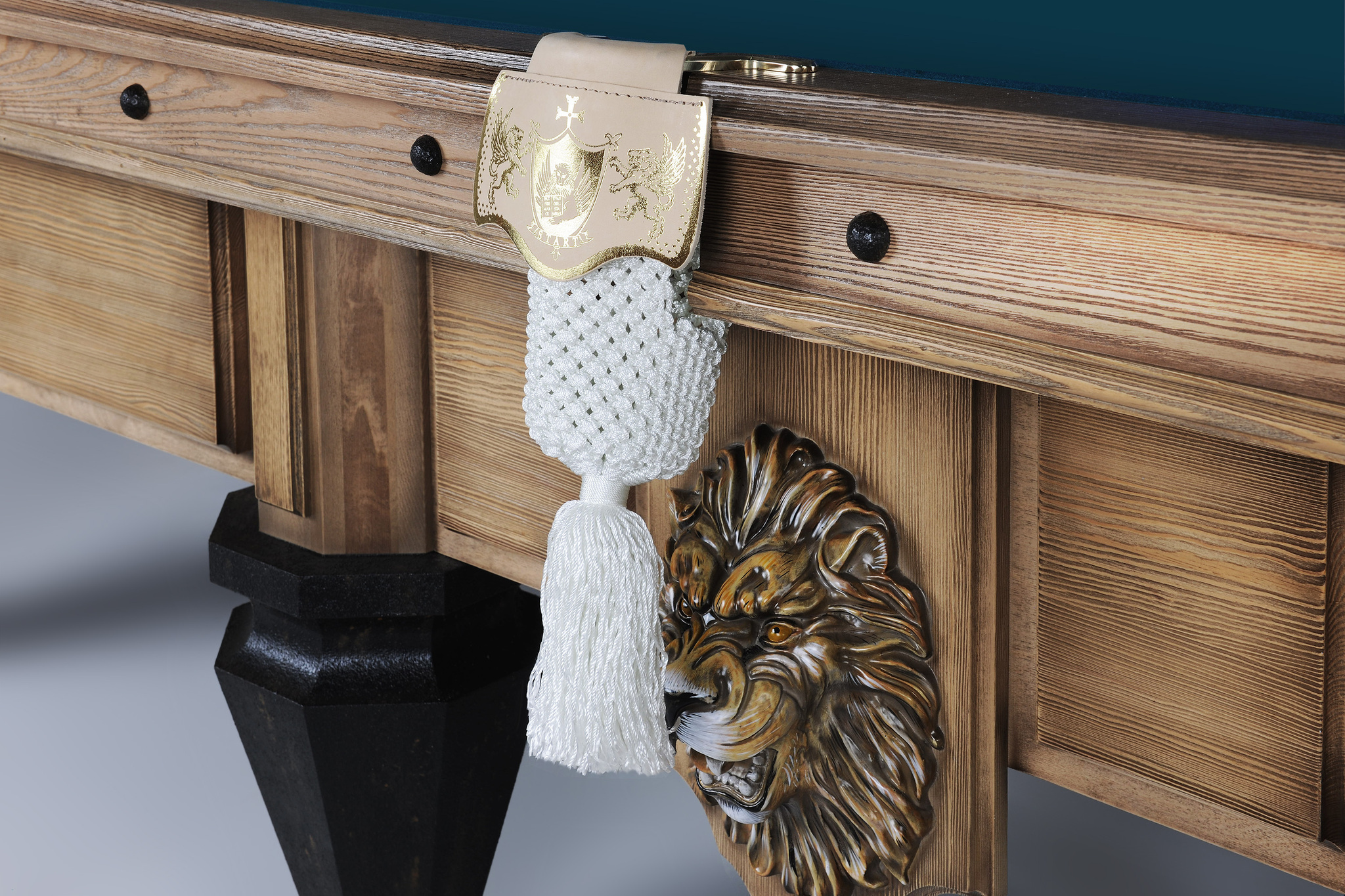 Стол выполнен из комбинации пород дерева: ясень/сосна/граб. В построении используется новая технология безупречного крепления борта к плите - Mount Perfect, которая гарантирует повышенную жесткость конструкции. Эффектные лузы отделаны кожей ручной работы с геральдическим тиснением.