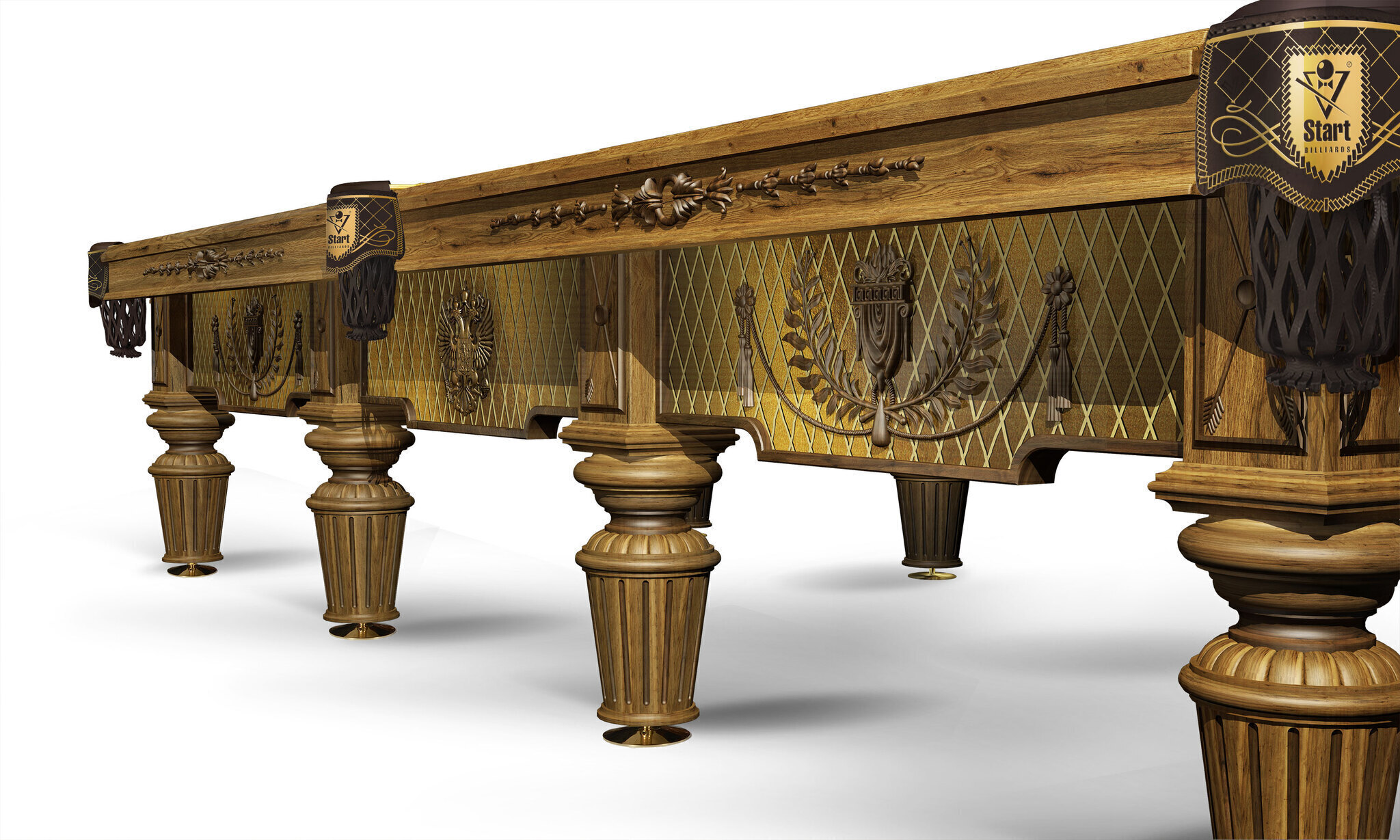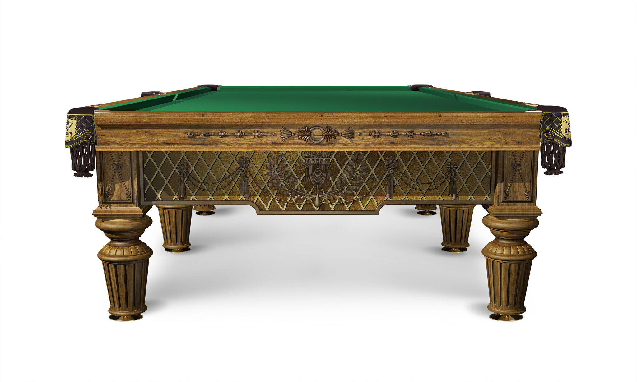 Бильярд с ручной резьбой на лафете изготовлен из отборного массива ясеня, в основание встроена эксклюзивная металлическая рама, придающая конструкции бильярда непревзойденную устойчивость. Сложная выкраска и тонирование включает слой покрытия смолой, поэтому поверхность имеет своеобразный 3D эффект.