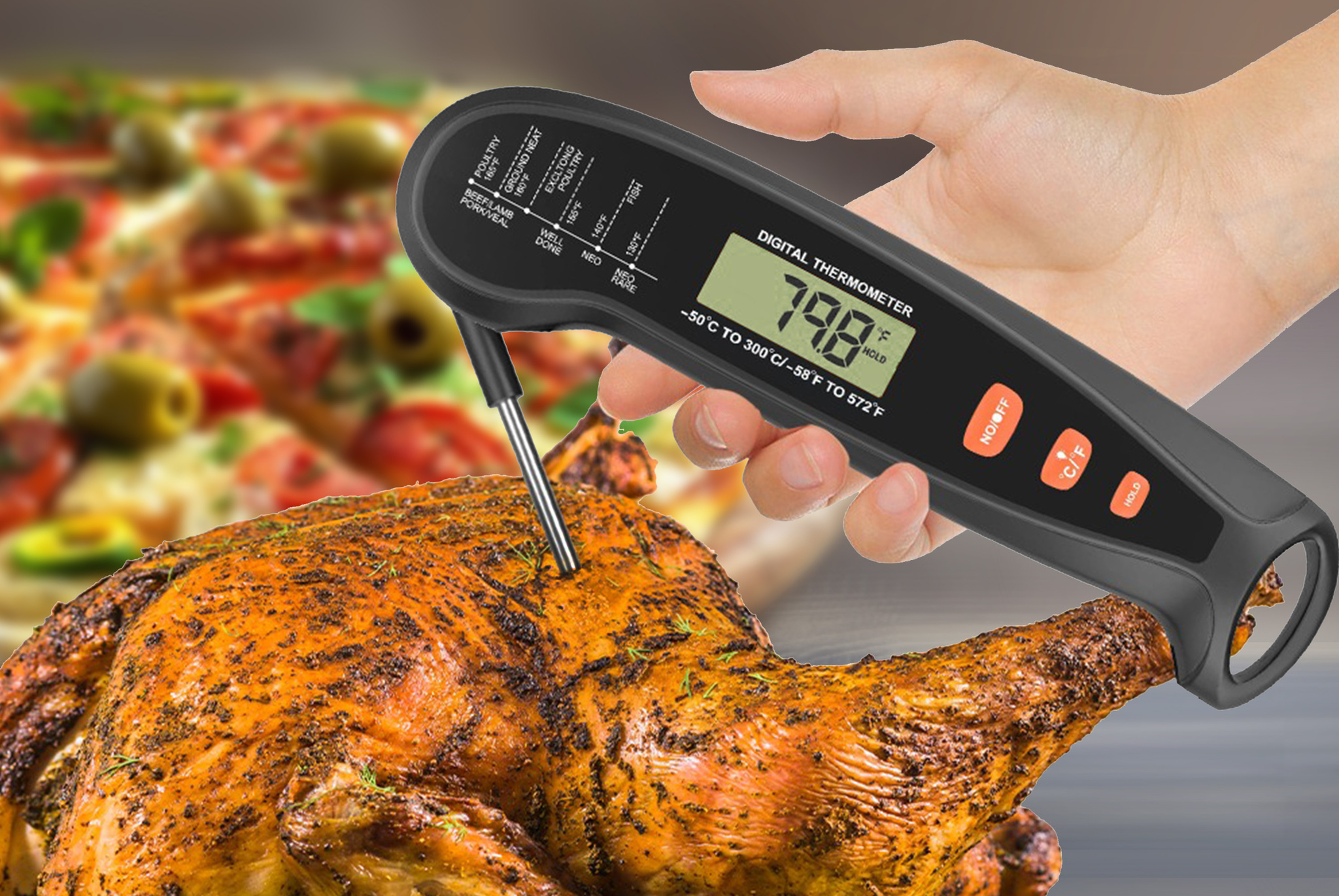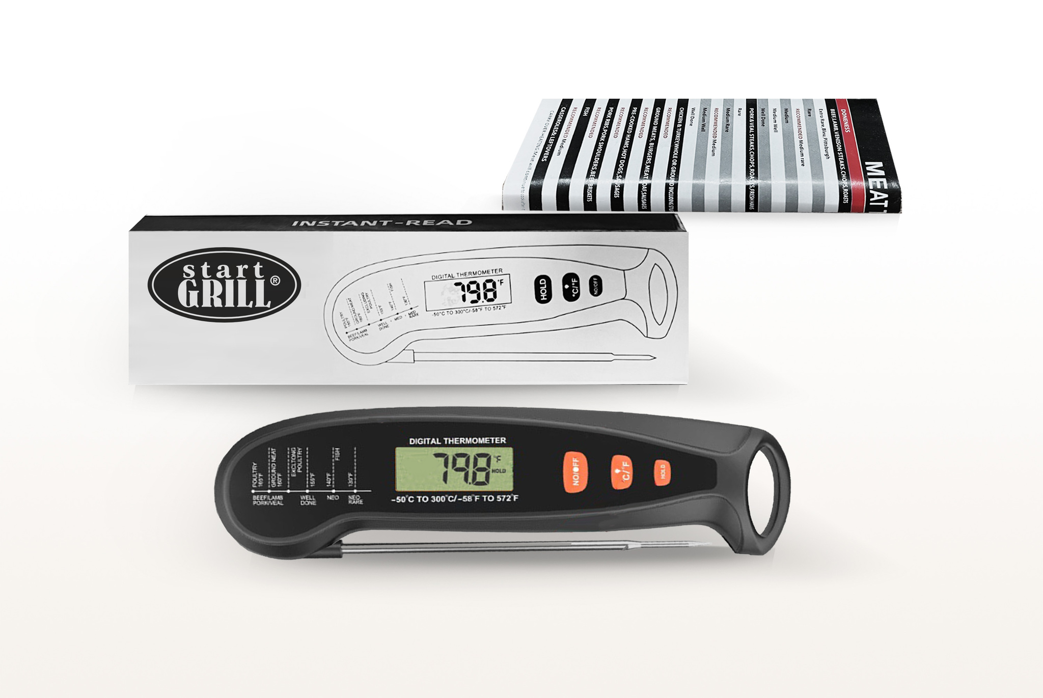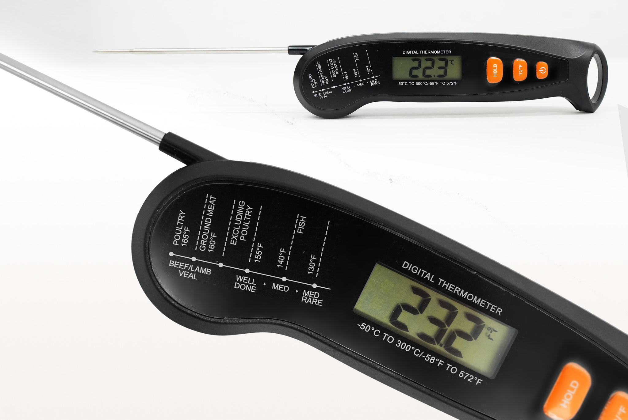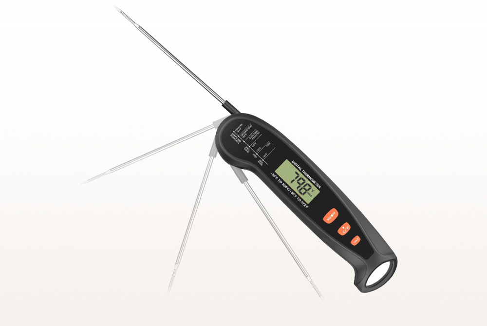 Складной цифровой термометр Model 1 — надежный и удобный инструмент для точного контроля процесса приготовления блюд. Термометр оснащен тонким поворотным зондом из нержавеющей стали, что позволяет легко погружать его в мясо, рыбу, выпечку и другие продукты, не повреждая их. Диапазон измерения от -50 °C до 300 °C #40;от -58 °F до 572 °F#41; делает его универсальным для контроля температуры приготовления различных блюд. Удобный для считывания дисплей с желтой подсветкой покажет температуру с точностью до ±1°F #40;±1°C#41; #40;в диапазоне -20 °C до 150 °C / 45 °F до 302 °F#41;. Управление с помощью кнопок на корпусе из экологичного ABS-пластика включает функцию фиксации температурных данных #40;HOLD#41;. Термометр работает от одной батарейки ААА, которая входит в комплект. Цифровой термометр Model 1 — идеальный выбор как для профессиональных поваров, так и для начинающих кулинаров.